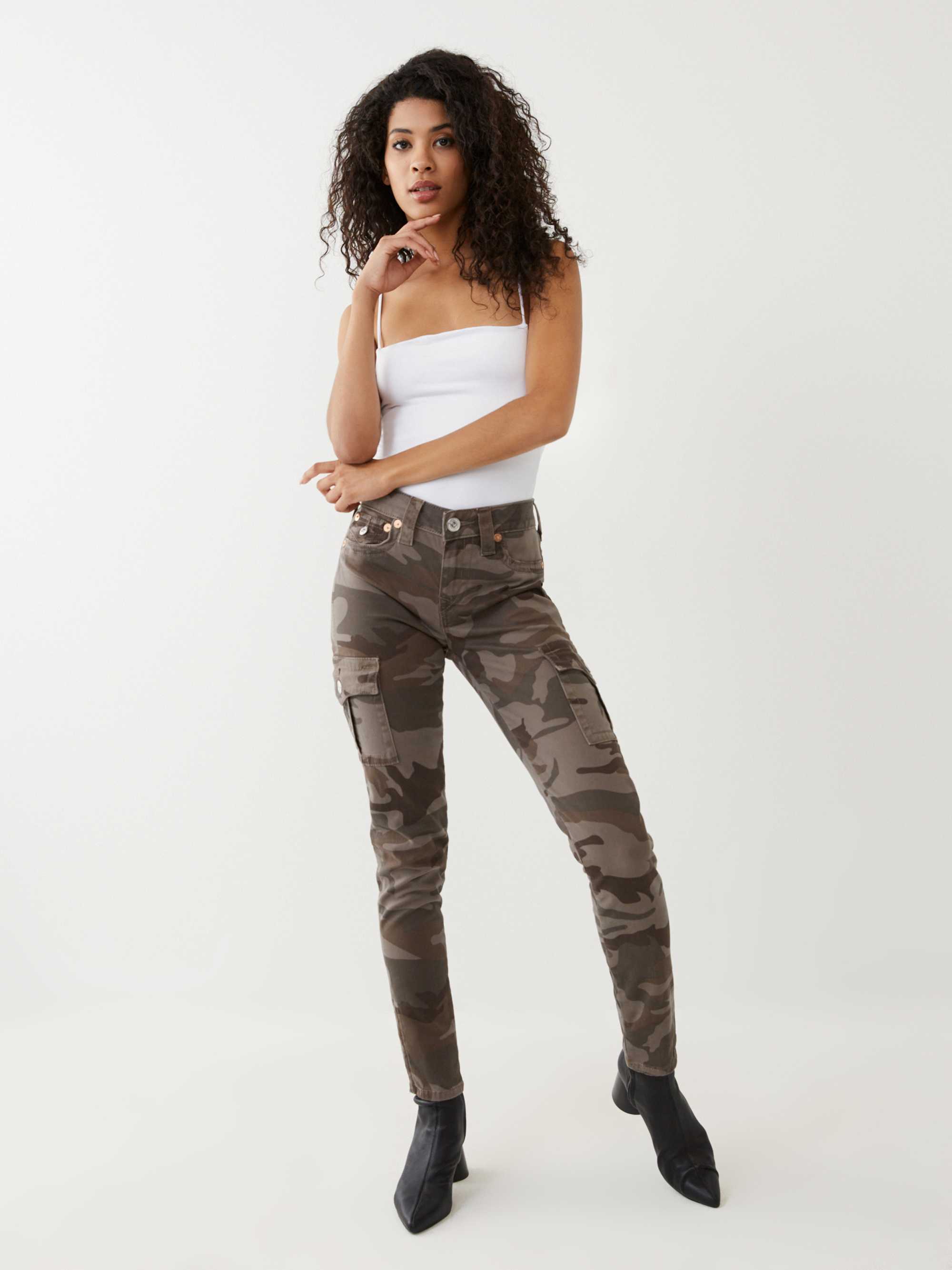 Can't quit camo? Neither can we. Meet the Camo Cargo Skinny Jean. This women's skinny jean features a cool washed camo design, our classic 5-pocket construction, plus roomy cargo side pockets. Finished with tonal stitching, tonal horseshoe detailing along the back pockets, and zipper detail at hem.